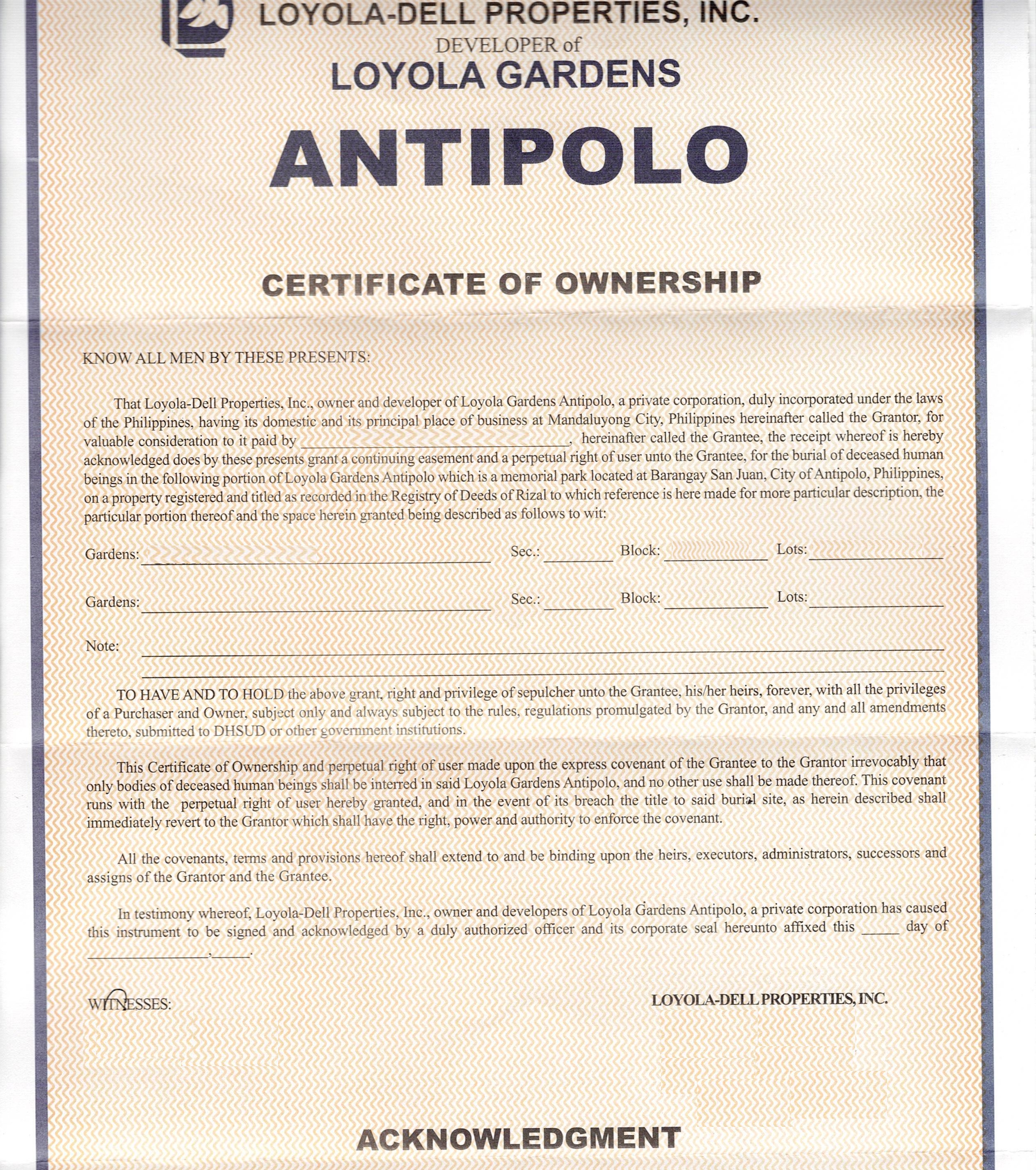 Certificate of ownership will be released 3-6 months after full payment of the Contract. A fee of Php 700.00 will be collected as payment for the processing and notarial of the document.
